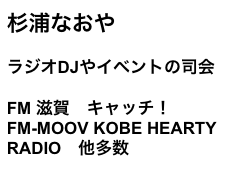 主な出演歴 FM 滋賀 キャッチ! FM-MOOV KOBE HEARTY RADIO 他多数